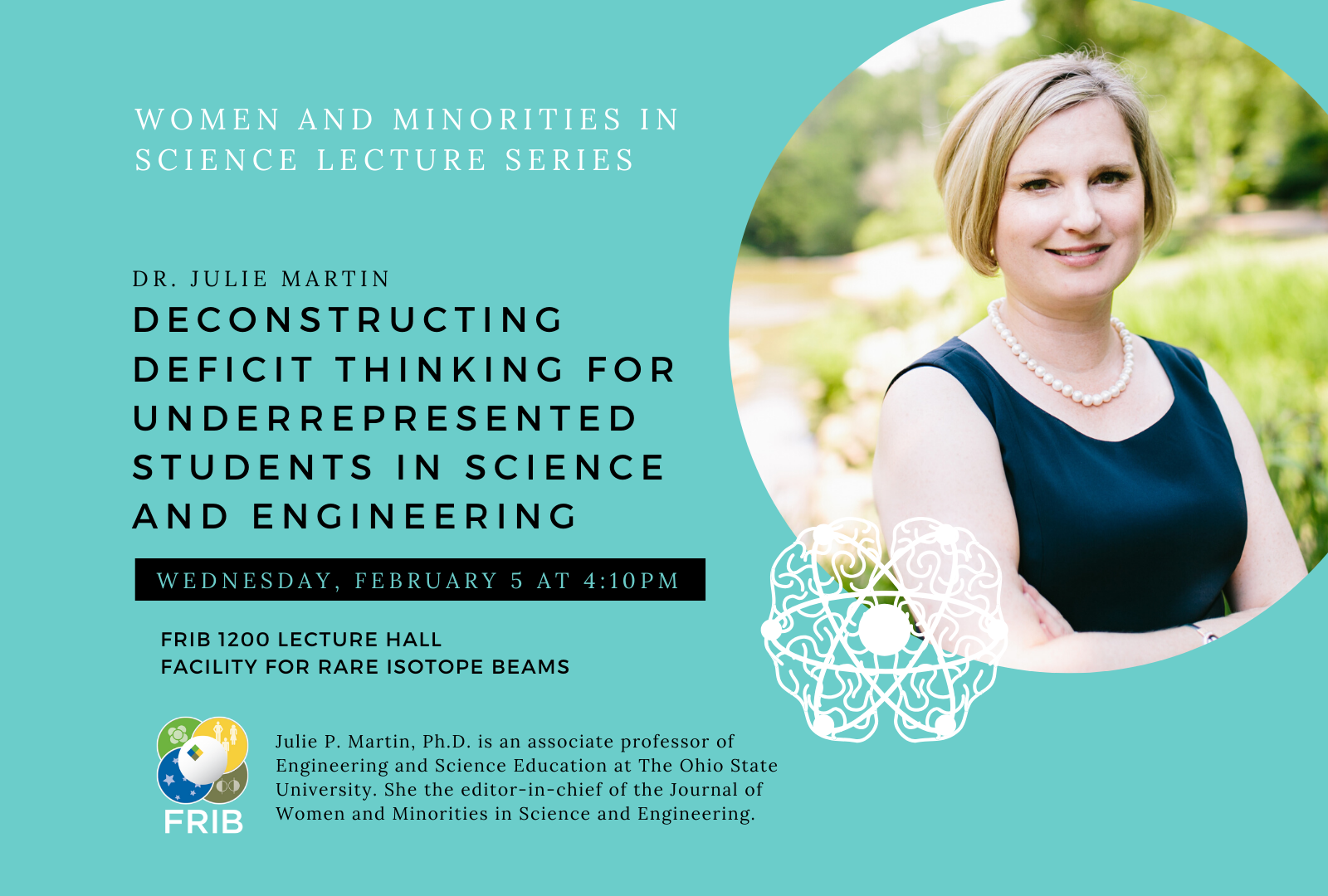 She will address "Deconstructing Deficit Thinking for Underrepresented Students in Science and Engineering." The event begins at 4:10 p.m. in the Facility for Rare Isotope Beams (FRIB) in lecture hall 1200.