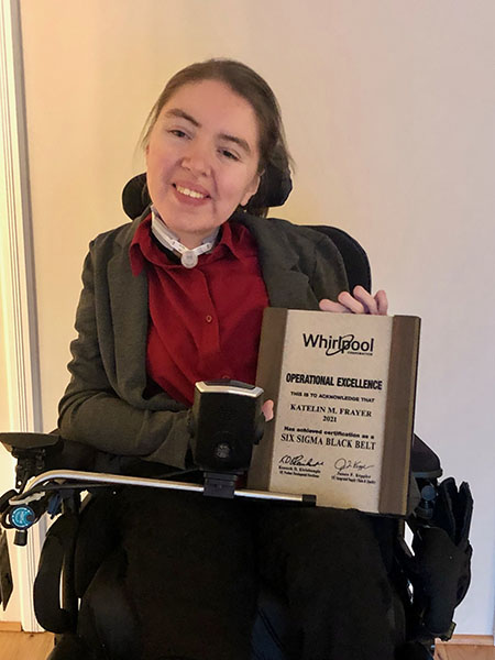 After earning her undergraduate degree at Michigan State University in 2019, Frayer completed the Whirlpool Engineering Rotational Leadership Development (WERLD) Program. This program allowed her to gain multifaceted experience within the company and as an engineer in general. During the program, she earned her OpEx Six Sigma Black Belt, which designates a prestigious level of operational excellence in her field.