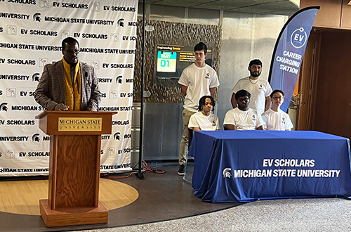 Michigan State University and the Michigan Economic Development Corp. (MEDC) put a new spin on “Go Green” by honoring the inaugural class of Michigander EV Scholarship recipients during a “Signing Day” ceremony at MSU’s College of Engineering on April 26.