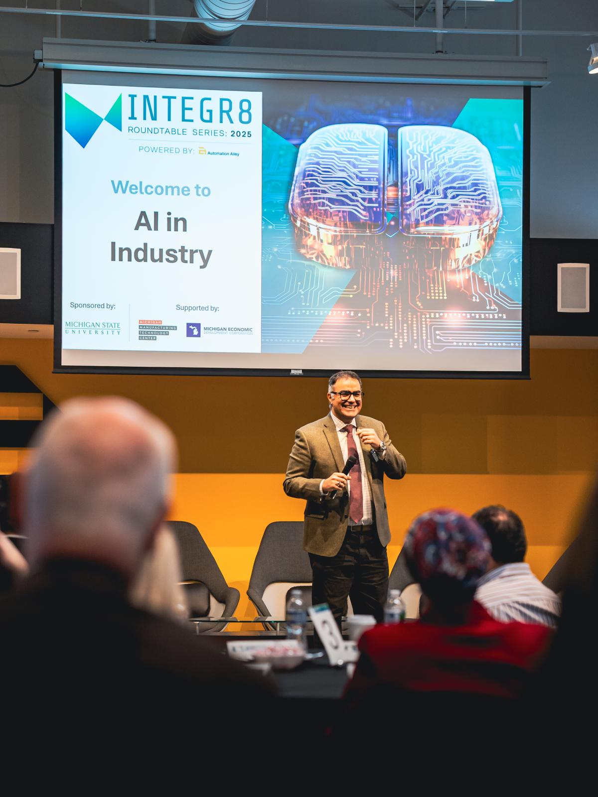 Mohsen Zayernouri, associate professor in the Department of Mechanical Engineering in the College of Engineering and the Department of Statistics and Probability in the College of Natural Science at Michigan State University (MSU), led the discussion titled “AI in Industry” at the Automation Alley Integr8 Roundtable on Feb. 13.