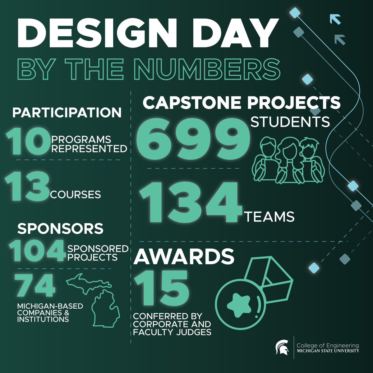 The MSU College of Engineering invites you to a showcase of our best and brightest at the 2025 Spring Engineering Design Day on April 25, 2025. One of MSU’s premier academic events, over 600 Spartan Engineering students will display their creative projects from 8:00 am to noon in the Engineering Building, 428 S. Shaw Lane, East Lansing. The event is free and open to the public.