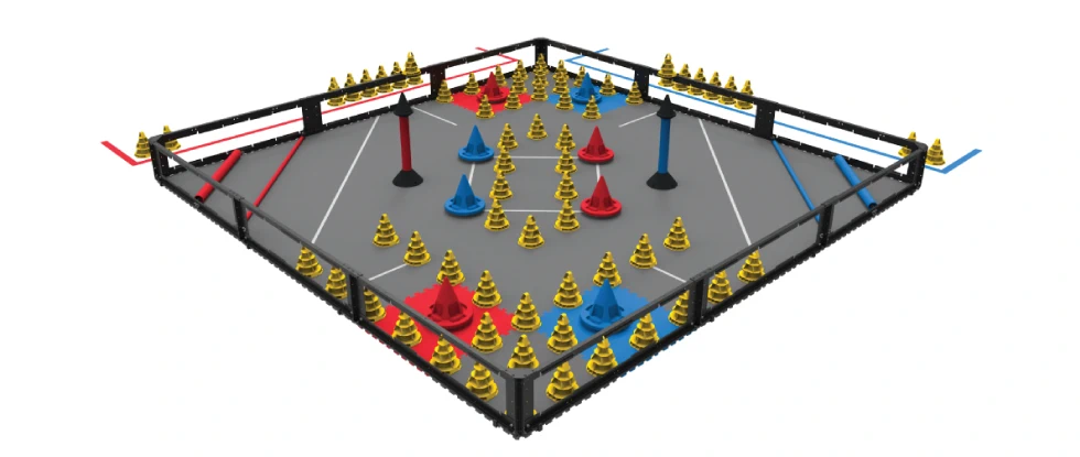 Using the VEX Robotics Design System, students build innovative robots and then compete on a 12-foot by 12-foot playing field. In this year's theme, VEX In The Zone, points are scored by moving cones and movable goals during timed contests. Two alliances, made up of two teams each, compete in qualifying matches. After qualifications, teams create three-team alliances.