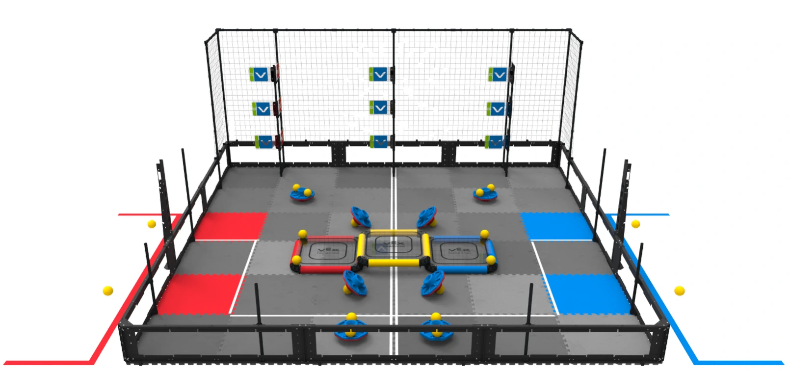 Kim explained that students build innovative robots and then compete on a 12-foot by 12-foot playing field. This year's game, VEX Turning Point, uses caps, flags, three-inch balls, and three platforms to score points during timed contests. Two alliances, made up of two teams each, compete in qualifying matches.