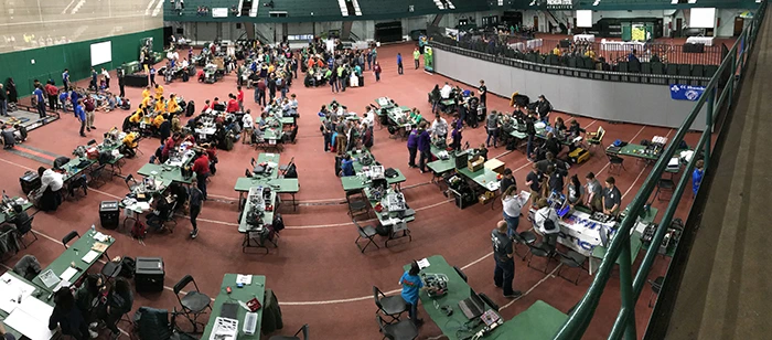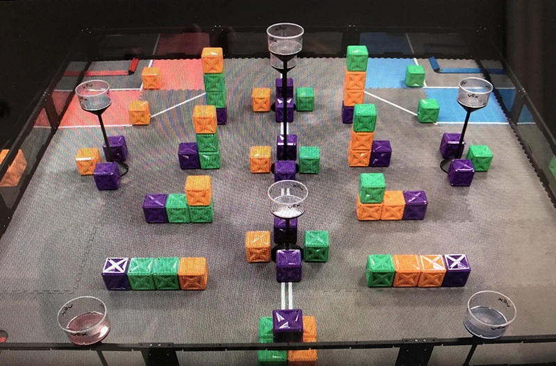 This year's participants have built innovative robots to compete on a 12-foot by 12-foot playing field. This year's game, VEX Tower Takeover, uses 66 colorful cubes on a Tower Takeover Field. Twenty-two cubes are green, 22 are orange, and 22 are purple. Towers are placed around the playing field, where players get points by piling the cubes onto the towers or placing them in a goal. Two alliances, made up of two teams each, compete in qualifying matches during timed-matches.