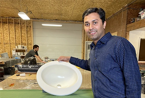 Lamp Endowed Chair John Dorgan and his research team are developing new styrene-free bio renewable resins with broad applicability in the construction of countertops, bathroom fixtures, windmill blades, and boats. Harshal Bambhania, a PhD student in chemical engineering, is helping advance the "Drop-in-bowl" prototype to modernize vanity and kitchen counters. Story featured in dBusiness Detroit.