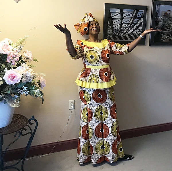 "Each outfit is 100 percent cotton from various regions of Africa. This year I've selected outfits from Nigeria, South Africa, and Ghana," she said. "These outfits are purchased for wear to weddings, church, funerals and special events that are common among my ancestors. The women wore them proudly, and so do I every occasion I get to show them off.