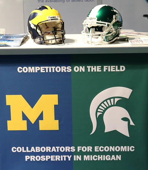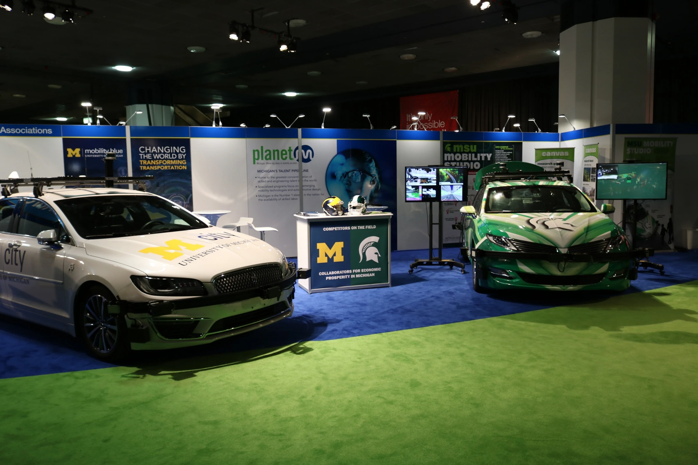 A colorful display of football helmets from the respective universities provides a Michigan-centric photo-op and an important symbol that MSU and the AutoMobili-D showcases the work happening in MSU's Mobility Studio, an integrated system encompassing autonomous and connected vehicles, smart infrastructure and mobility management. CANVAS - Connected and Autonomous Networked Vehicles for Active Safety - is the vehicle component of that effort.