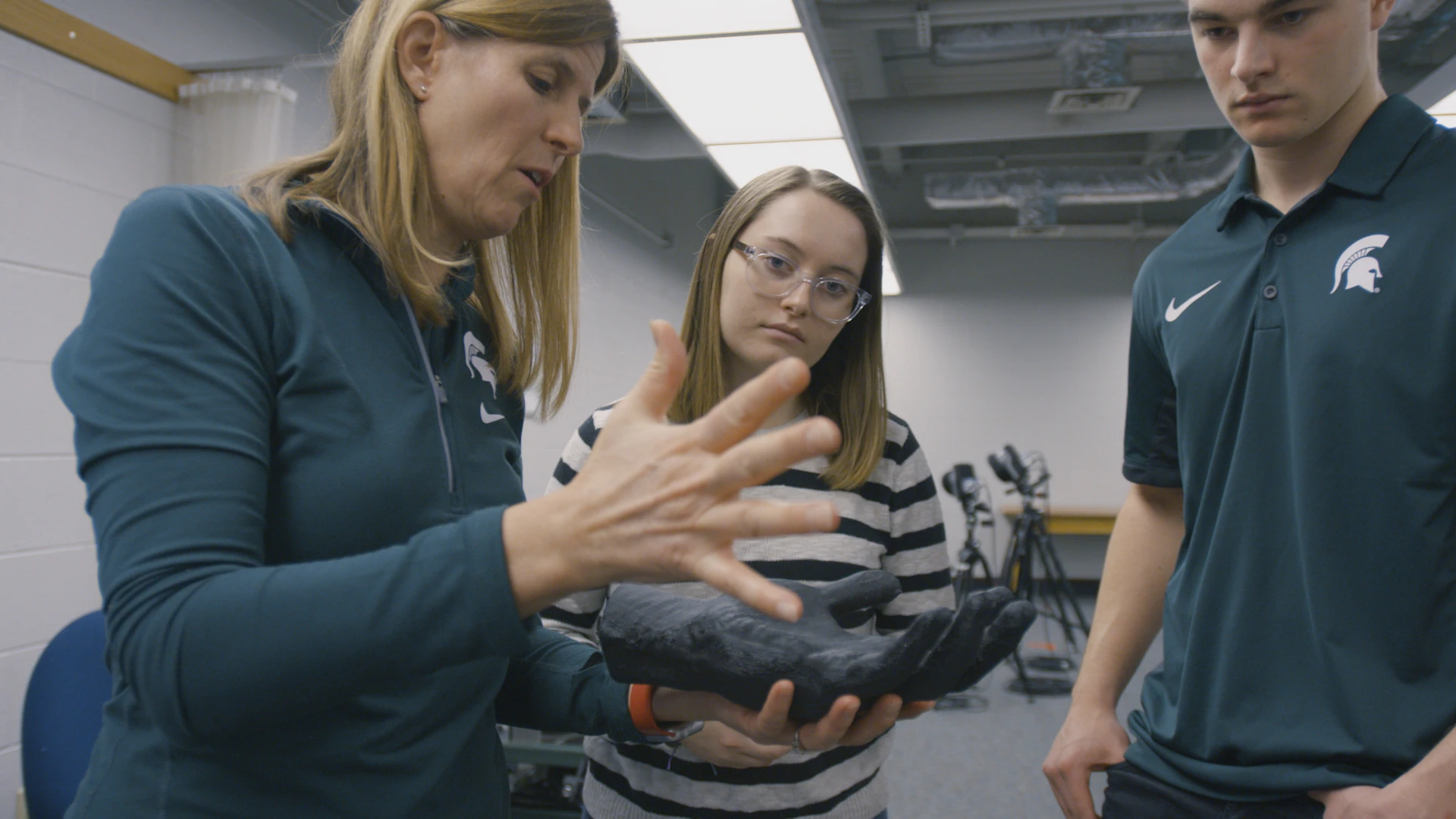 The process began when Richey's request was forwarded to Reid Bush. Her team scanned Ward's hand and created a 3D model. Working with Ward's stand-in - Xavier Tillman, MSU forward - her lab also collected force data to gauge the stress caused from dribbling, passing and shooting.