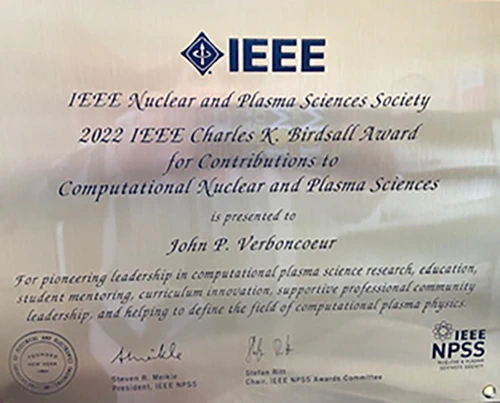 John Verboncoeur of Michigan State University will receive the 2022 Charles K. Birdsall Award from the Nuclear and Plasma Sciences Society (NPSS) of the Institute of Electrical and Electronic Engineers (IEEE).