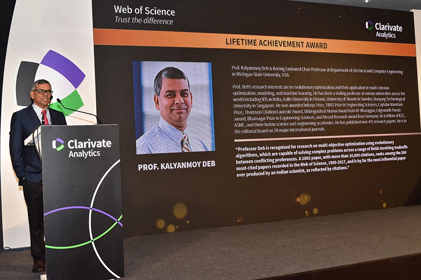 Koenig Endowed Chair Kalyanmoy Deb received the inaugural Lifetime Achievement Award from Clarivate Analytics for his highly cited research contributions during ceremonies in New Delhi, India, on Nov. 3.