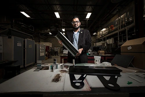 For his part, Haq’s research focuses on composite materials that combine carbon fibers and polymers into lightweight material. These composites can be many times stronger than steel at a fraction of the weight.