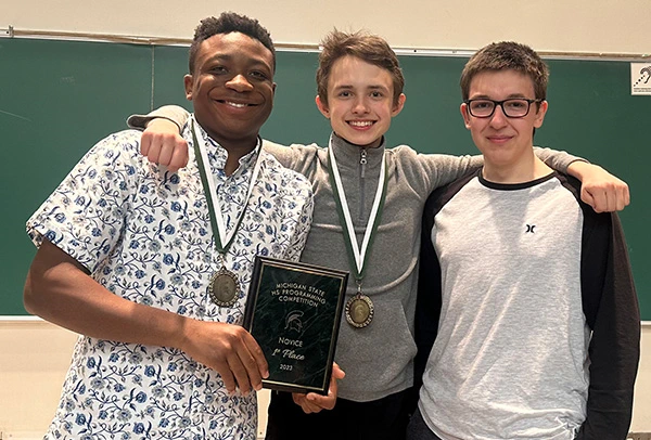 Continuing the winning legacy from the Kalamazoo Area Math and Science Center were Team Silver Smiths, who won first place in the Experienced Category. Members are Lucas Oeming, Levi Scranton, and Aryaman Mishra.