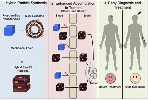 For our research, we use exosome or cell-coated Prussian blue nanoparticles that can cross the blood-brain barrier and specifically target tumor cells. Once the particles are near the tumor region, they can allow for early detection and localized treatment using heat. We use a photothermal treatment that uses laser light to illuminate the particles, which creates localized heat that kills cancer cells. This treatment also doesn’t cause those nasty side effects we often see with chemotherapy treatment.