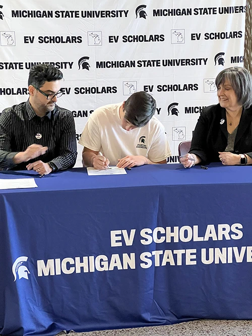 Michigan State University and the Michigan Economic Development Corp. (MEDC) put a new spin on “Go Green” by honoring the inaugural class of Michigander EV Scholarship recipients during a “Signing Day” ceremony at MSU’s College of Engineering on April 26.