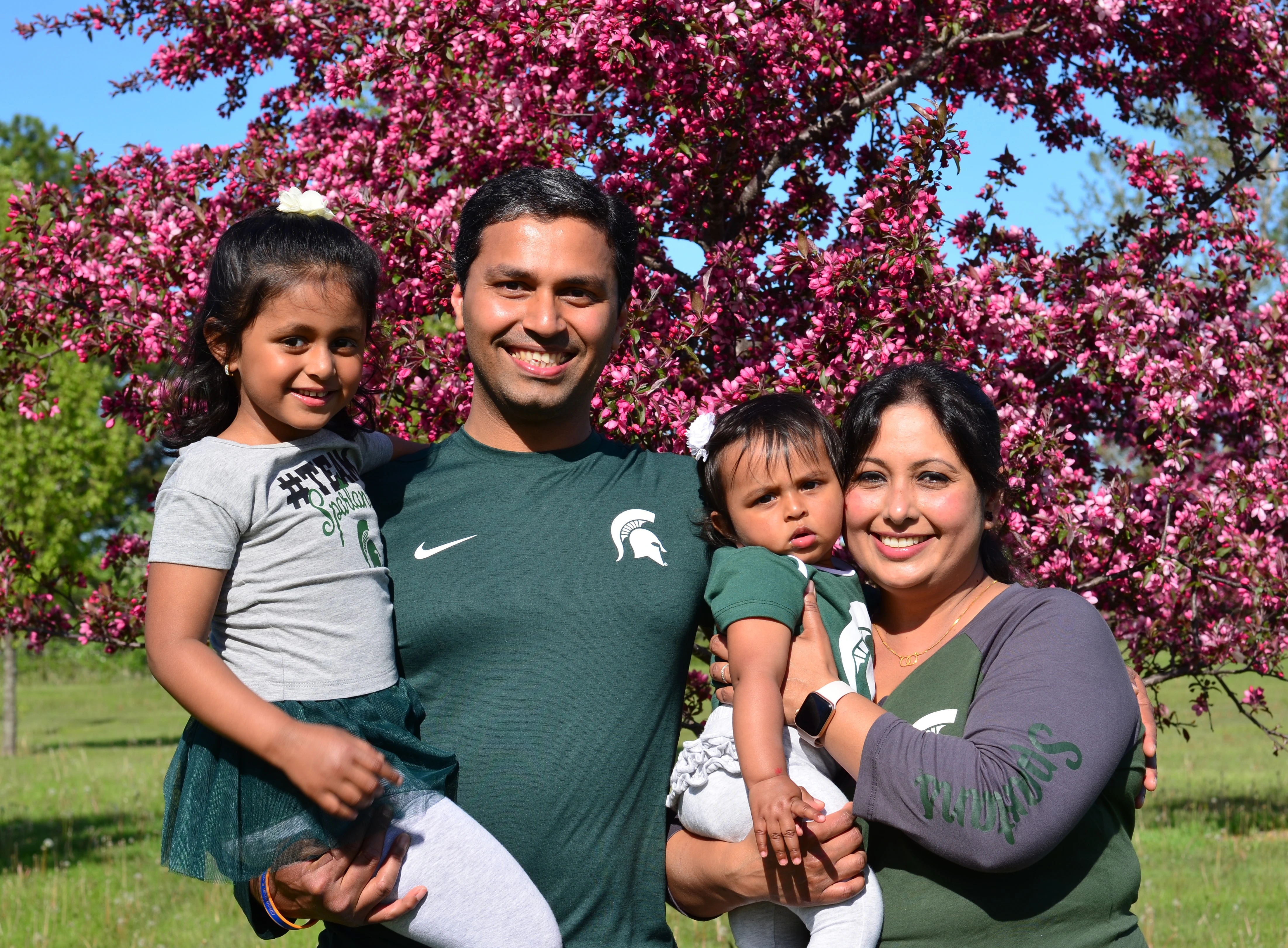 "Harshal (MS, chemical engineering, '11) and his wife, Deboleena Chakraborty (PhD, chemical engineering '10) met in graduate school at MSU. Harshal is helping raise his two daughters, Harleen, 4, and Ashleen, 1, while Deboleena works as a research scientist at Dow.