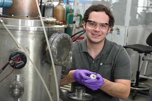 Matthias Muehle, scientist at Fraunhofer USA, Inc., and an adjunct professor in MSU’s College of Engineering, presented his work to improve EV range and faster charging, which was developed in partnership with MSU.