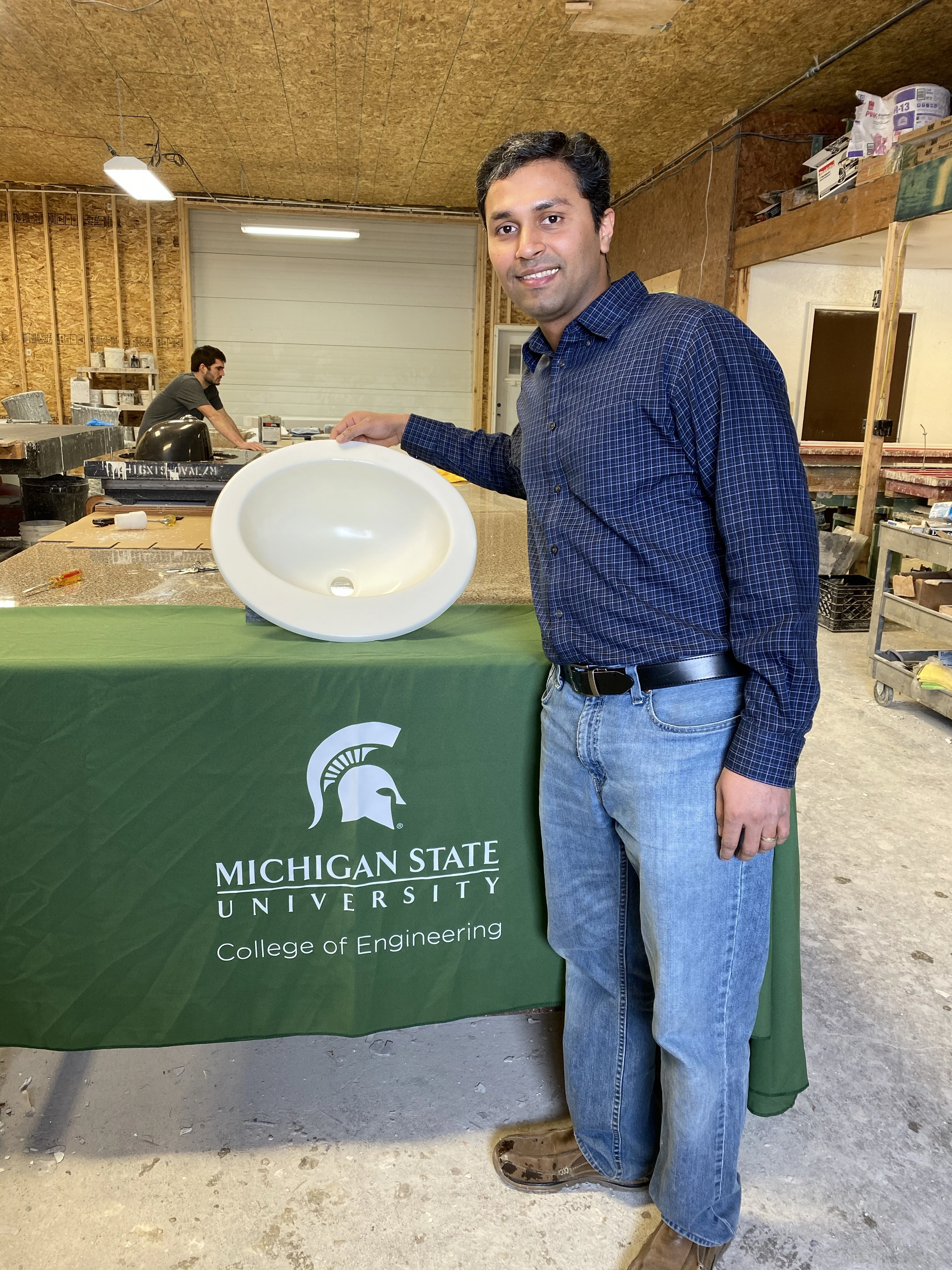 The research team of Lamp Endowed Chair John Dorgan is developing new styrene-free bio renewable resins with broad applicability in the construction of countertops, bathroom fixtures, windmill blades, and boats. Harshal Bambhania, a PhD student in chemical engineering, is helping advance the "Drop-in-bowl" prototype to modernize vanity and kitchen counters.