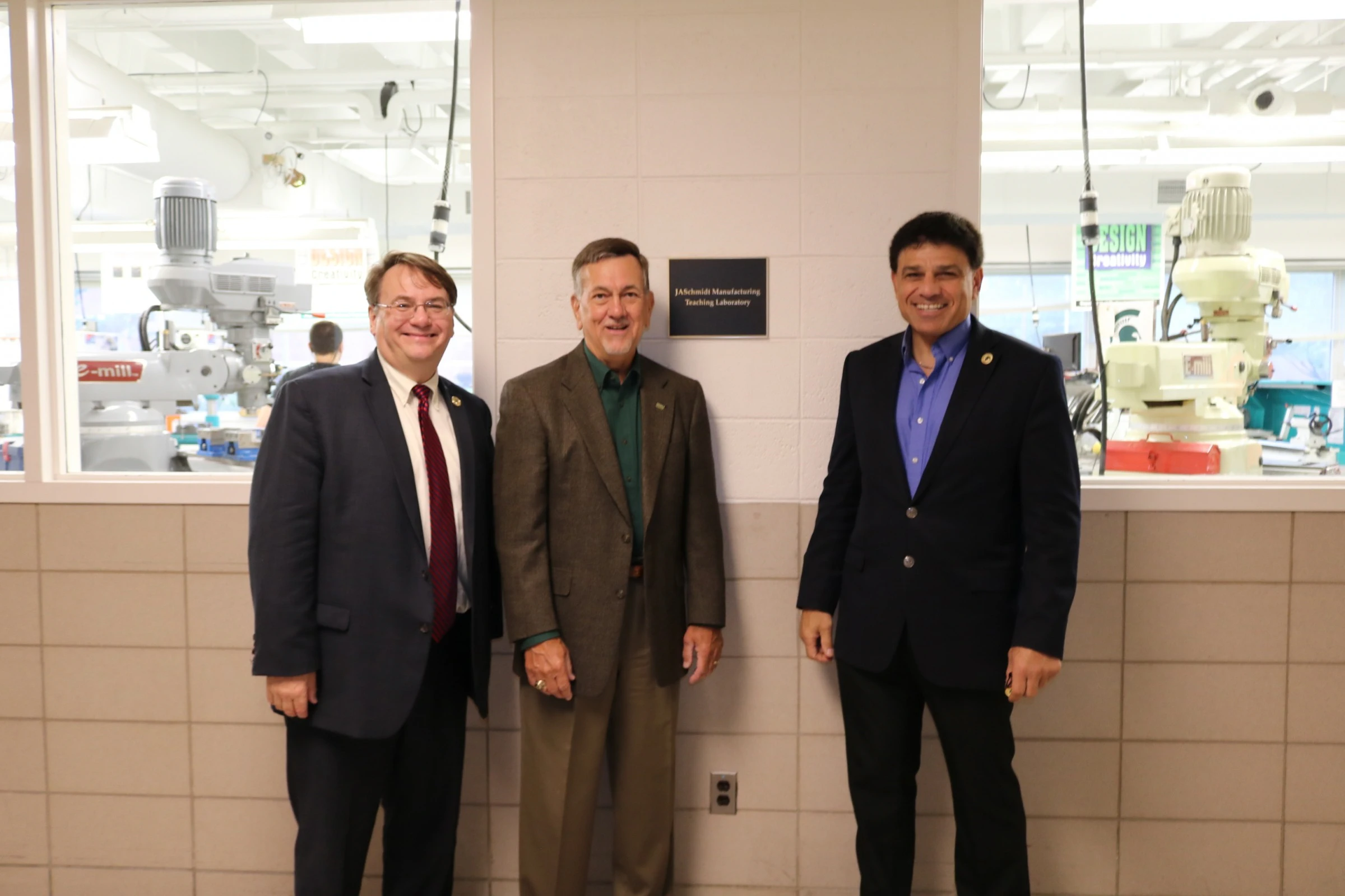 A plaque recognizing the friendship of James A. Schmidt to the Michigan State University College of Engineering was unveiled on Sept. 10 during the dedication of the JASchmidt Manufacturing Teaching Laboratory in the Engineering Building.