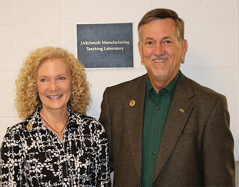 Schmidt, along with his partner Karen West, Engineering Dean Leo Kempel, and others gathered in the Engineering Building to reveal the nameplate that honors the 1971 mechanical engineering graduate and his gift of $250,000 making the lab possible.