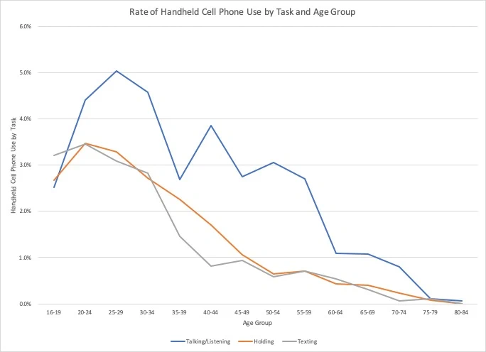 "Cell phone use continues to be the most discussed distraction concern at the national level, and rates are consistently highest among the younger age groups, generally declining with age," he said. "Interestingly, use rates are not quite as high among the youngest age group, which is partially reflective of the context under which these individuals drive.